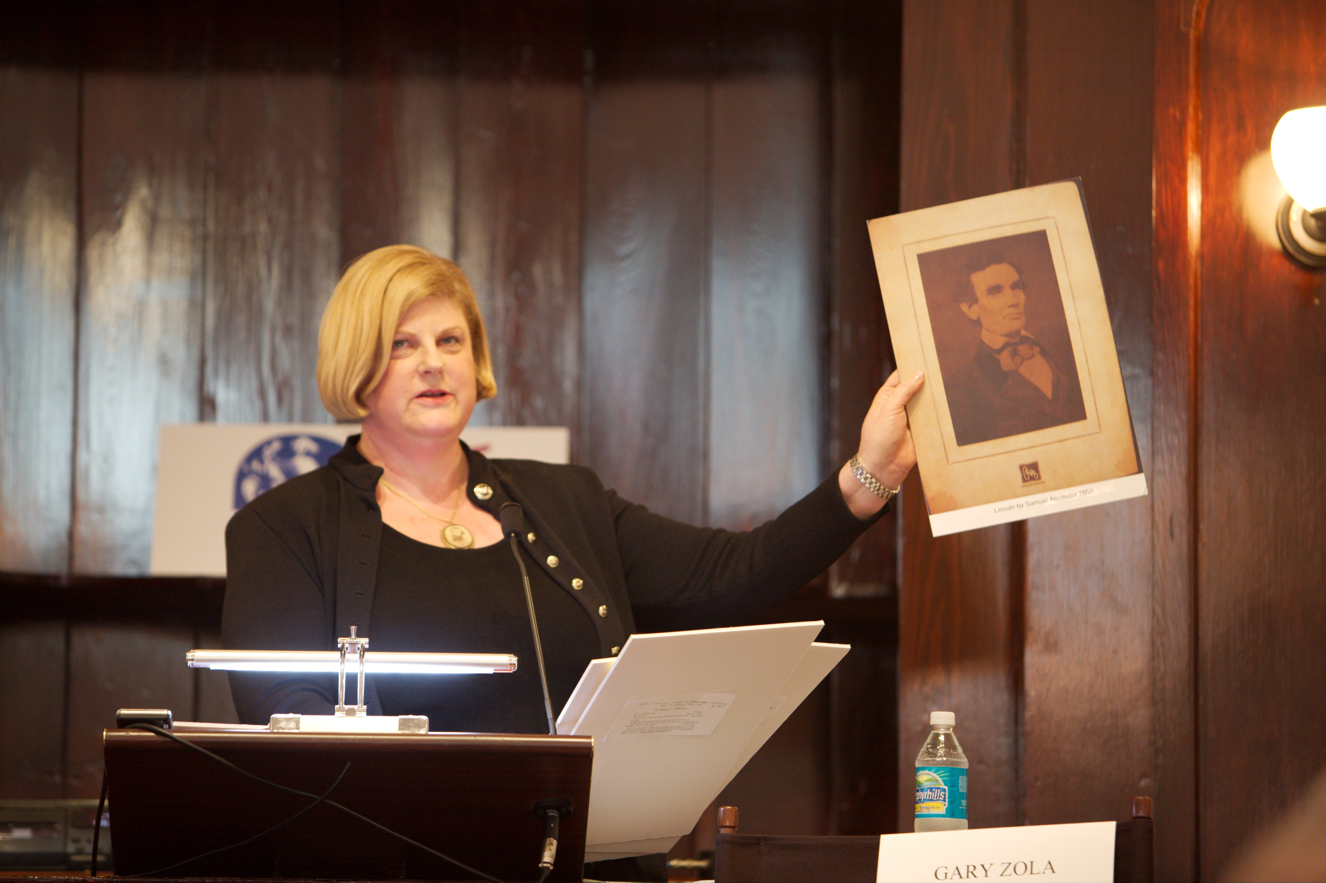 Jean Soman holding Lincoln photo by Samuel G. Alschuler